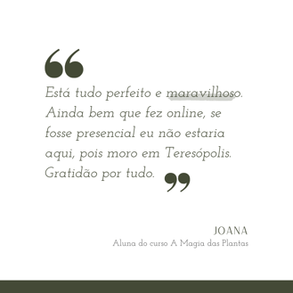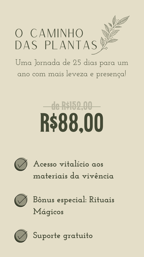 Após concluir a jornada O Caminho das Plantas, você receberá uma experiência extra: rituais mágicos especialmente preparados para apoiar e inspirar seu novo ciclo. Esses rituais irão ajudar a integrar as energias de cada planta, trazendo clareza, renovação e equilíbrio para os novos passos. Que este bônus seja uma fonte de inspiração para começar o próximo ciclo com intuição e propósito.